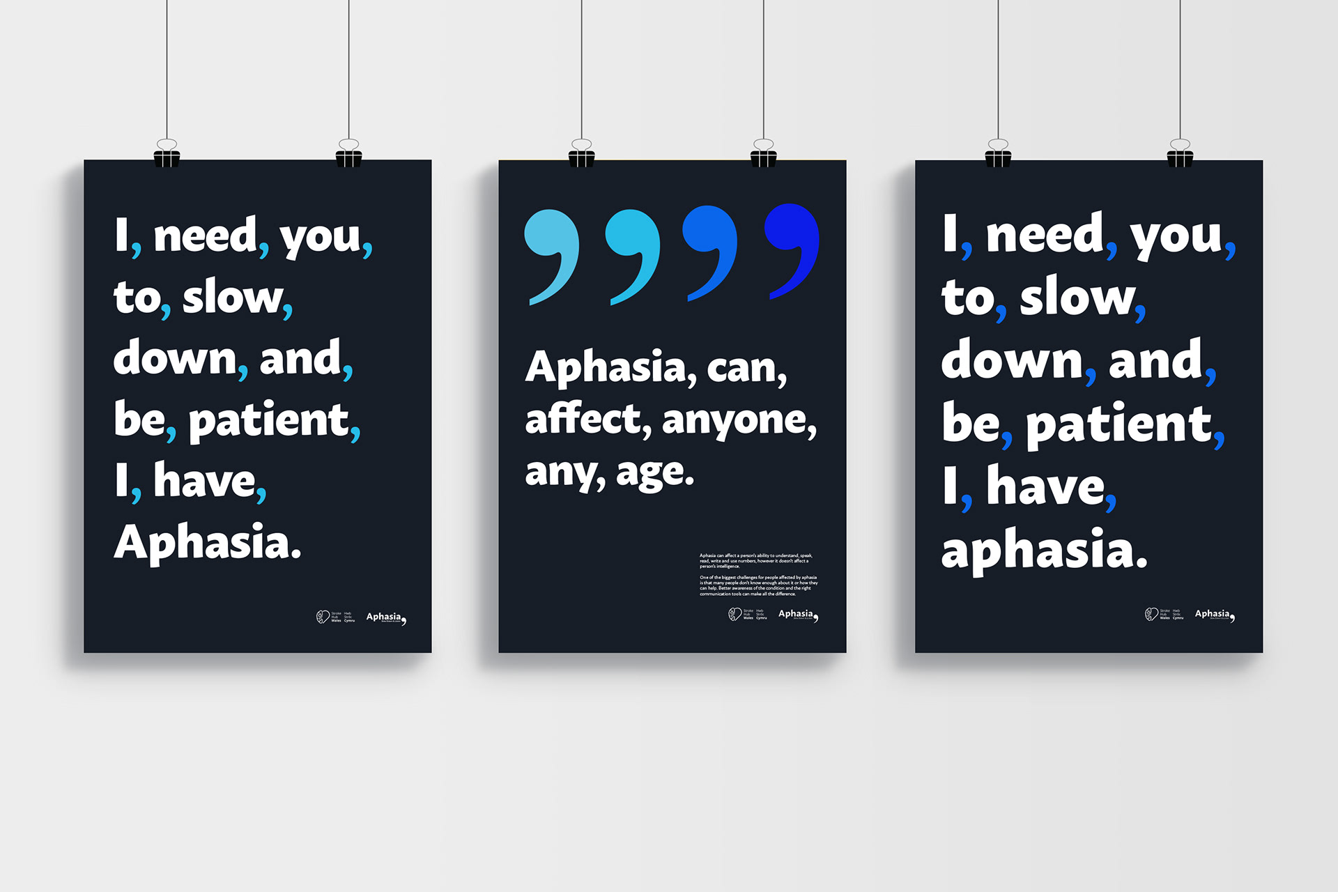 The aim is to encourage people to take the time to slow down and really listen to someone who suffers from Aphasia. The use of the comma is to symbols taking a pause and a deep breath. When people see a comma, they pause and take time which is what the campaign is asking people to do in order to communicate effectively with someone who suffers from Aphasia.